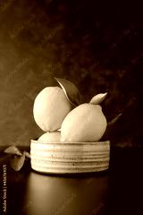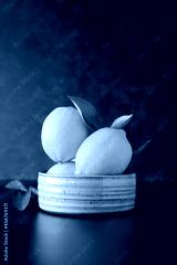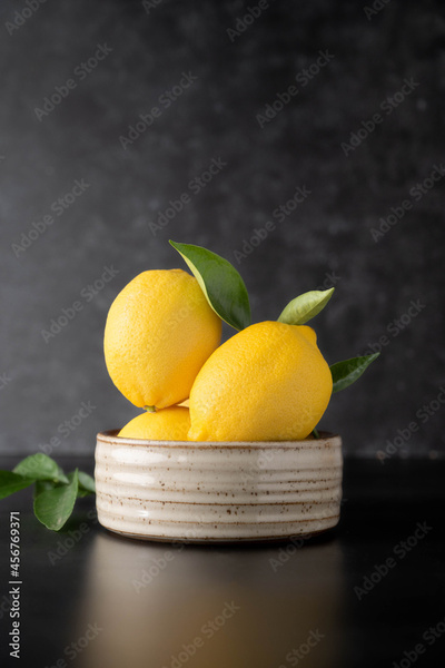 Fresh lemons fruit on dark, black background in a bowl