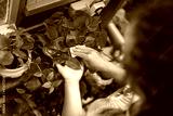 Woman wipes dust from plant leaves