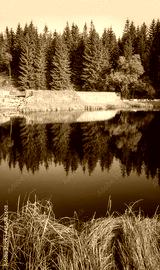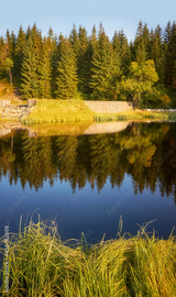 Mountain forest reflected in a pond at sunset, Karkonosze National Park, Poland.