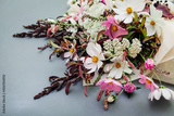 Fresh bouquet of white pink flowers with burgundy foliage wrapped in paper and arranged on grey background.