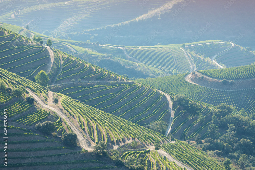 Aerial view of the terraced vineyards in romantic sunset in the Douro Valley near the village of Pinhao. Concept for travel in Portugal and most beautiful places in Portugal Port wine wine farm Unesco
