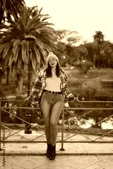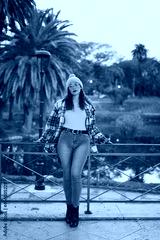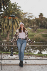 Vertical shot of a stylish female wearing a plaid jacket, white warm hat, and glasses in the park