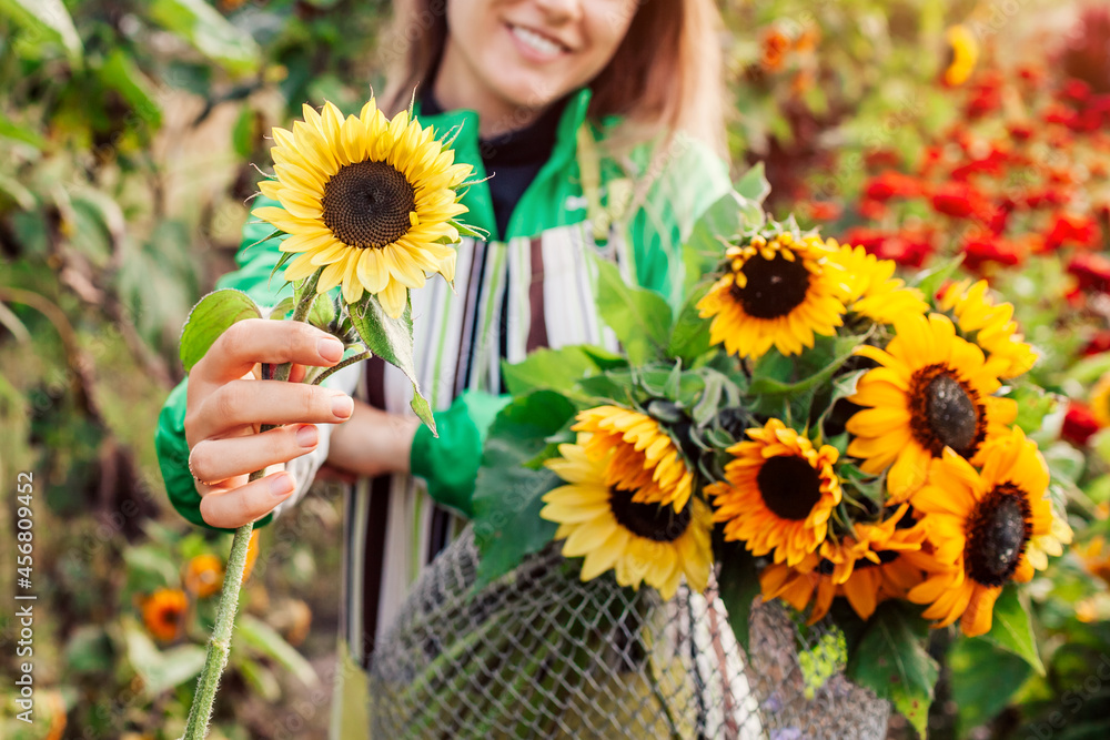 Woman gardener holds bouquet of yellow lime sunflowers in summer garden. Cut flowers harvest picking