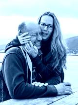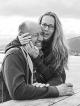 Caucasian middle-aged couple hugging in a park in front of a lake with mountains in the background