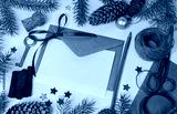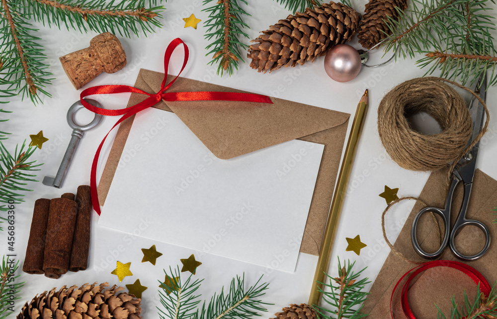 concept of greeting card for christmas and new year on white background. envelope and fir branches.
