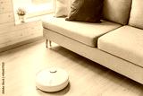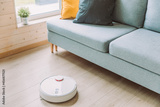 Wireless Robotic vacuum cleaner cleaning a wooden floor in living room