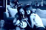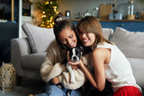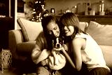 Two women hugging a puppy dog
