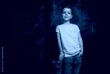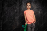 Schoolboy skateboarder with green skateboard on background of black chalk board with copy space. Stylish athletic boy ready to skateboarding. Childhood and active urban lifestyle.