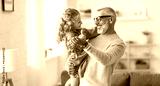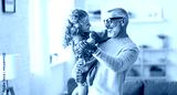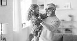 Adorable child girl and positive grandpa holding hands while dancing together in living room