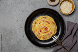 Pasta carbonara, spaghetti, pancetta, egg yolk and parmesan cheese, black pepper in black plate on dark grey surface. Top view.