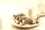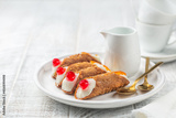 Breakfast with Italian pastry cannoli with ricotta cheese cream topped with cherries. Coffee cups on background. White wood surface. Copy space.