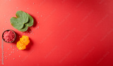 Happy Dussehra. Yellow flowers, green leaf and rice on red background. Dussehra Indian Festival concept.
