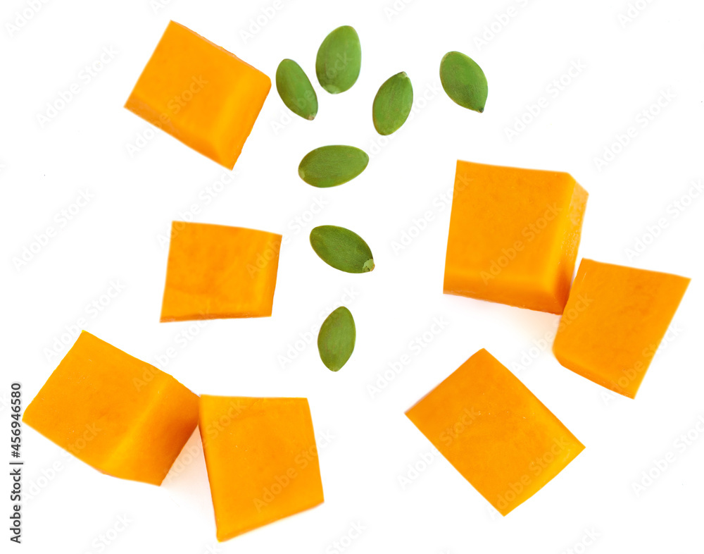 Pumpkin pieces isolated on white background. Pumpkin cubes with green seeds. Top view. Flat lay
