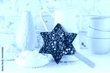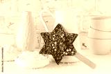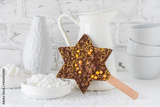 Star shaped chocolate lolly with gold sugar pearls on white background