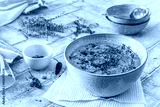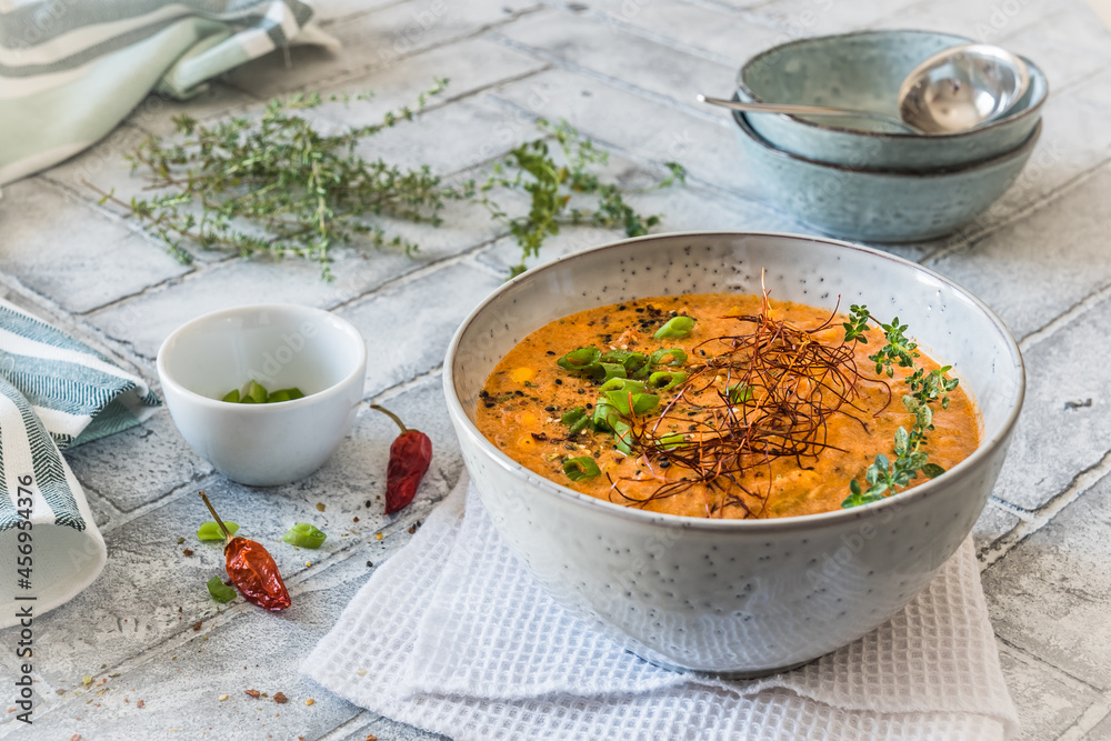 Tomato vegetable cream soup with chili,spring onions and fresh herbs on gray background