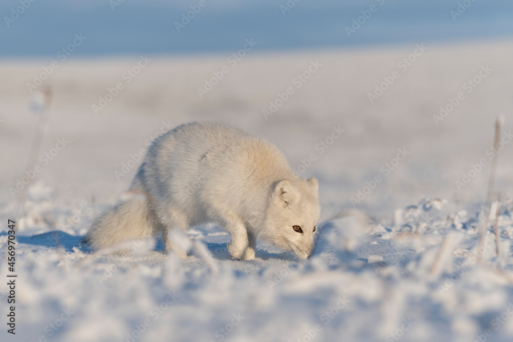 Wild arctic fox (Vulpes Lagopus) in tundra in winter time. White arctic fox.