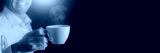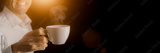 a businessman drinks coffee during a break. Advertising space on cup and black background