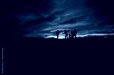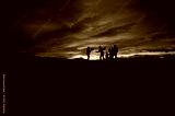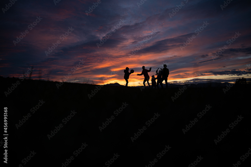 Silhouette of a family playing with a ball outside on a hill at sunset
