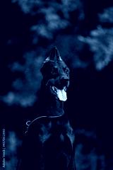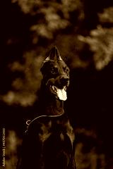 Beautiful dog Doberman Pinscher breed with autumn forest