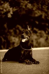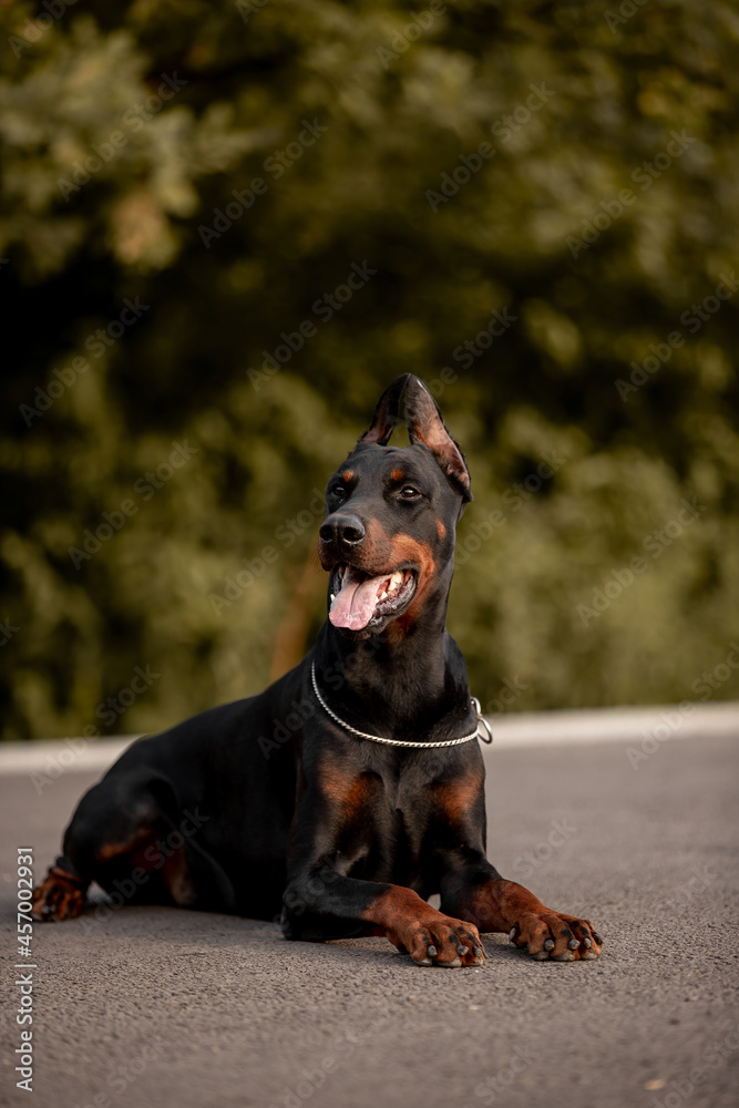Beautiful dog Doberman Pinscher breed with autumn forest