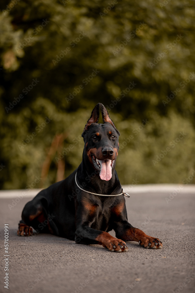 Beautiful dog Doberman Pinscher breed with autumn forest