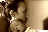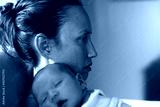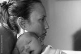A sad mother sitting at home suffering from postpartum depression. Motherhood problems.