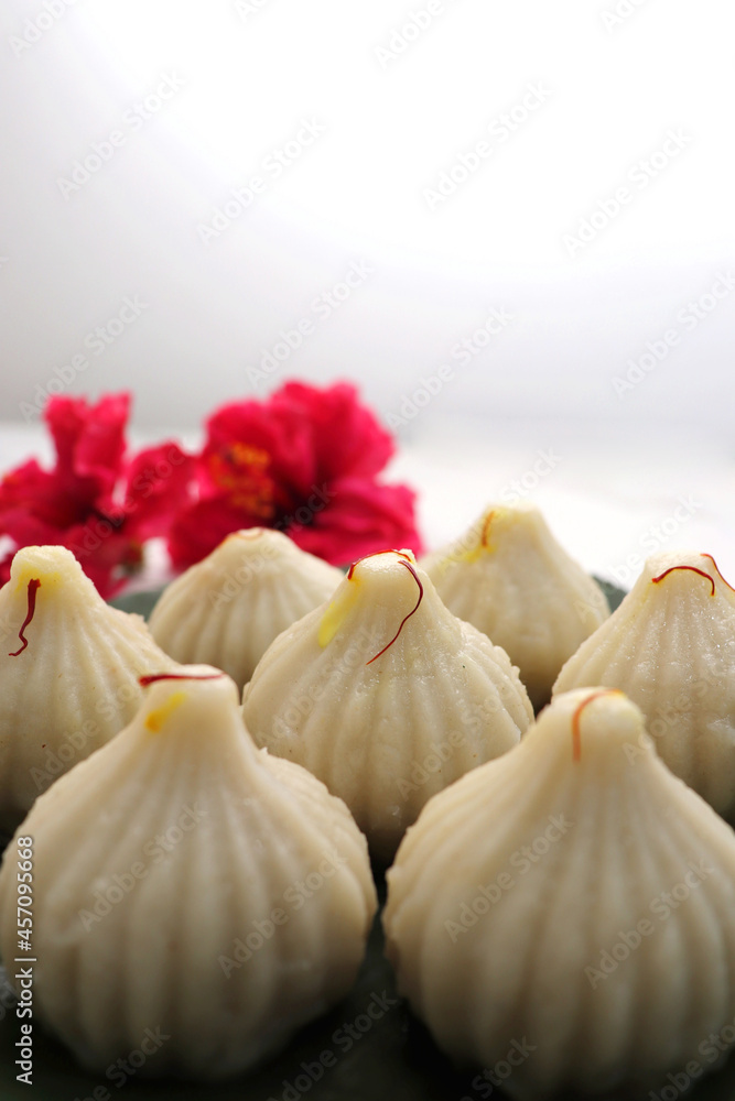 Steamed or ukdiche Modak. It's a traditional sweet dish made out of coconut, jaggery and dry fruits stuffed inside rice dough. Offered to Lord Ganesha during Ganpati festival in India. with copy space