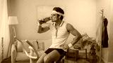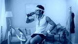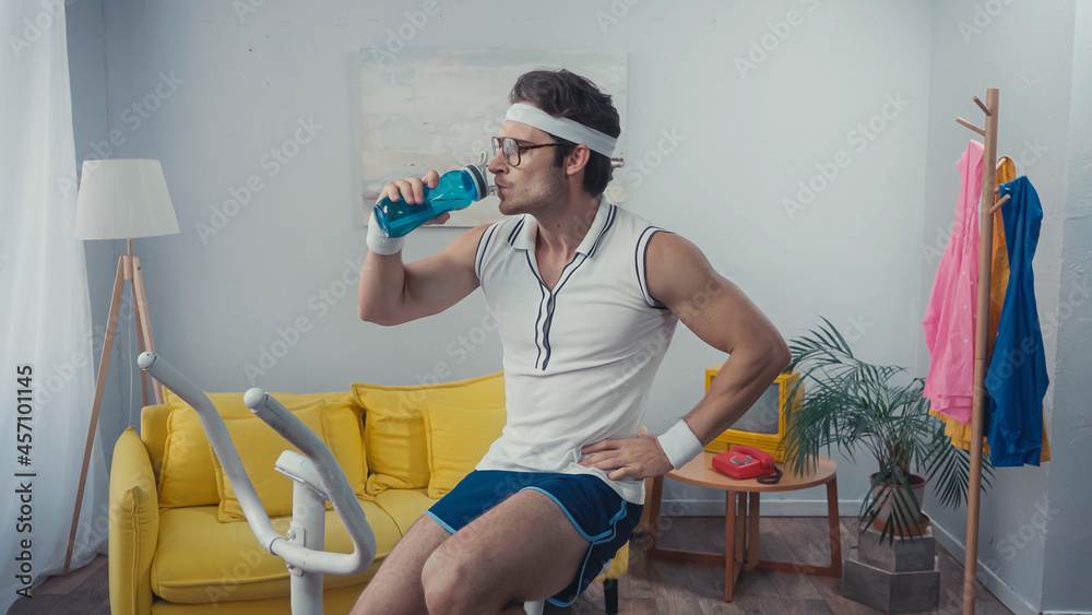 sportsman working out on exercise bike and drinking water in living room, retro sport concept