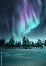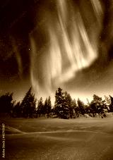 The Aurora Northern Lights flicker in the winter night sky above a forest in Sweden. Photo Composite.