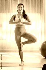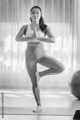 Young Asian woman practicing yoga exercise at home. Daily sports routines for a healthy lifestyle and stress relief.