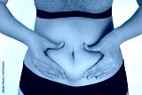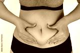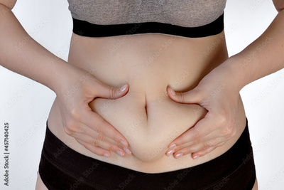 female hands holding a fold of skin on the abdomen, the concept of excess weight, visceral fat, saggy skin after pregnancy and childbirth,
