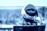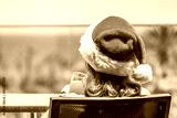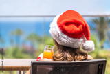 Woman in christmas santa claus hat relaxing and drinking cocktail on balсony opposite palm trees beach and sea. New year