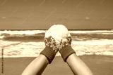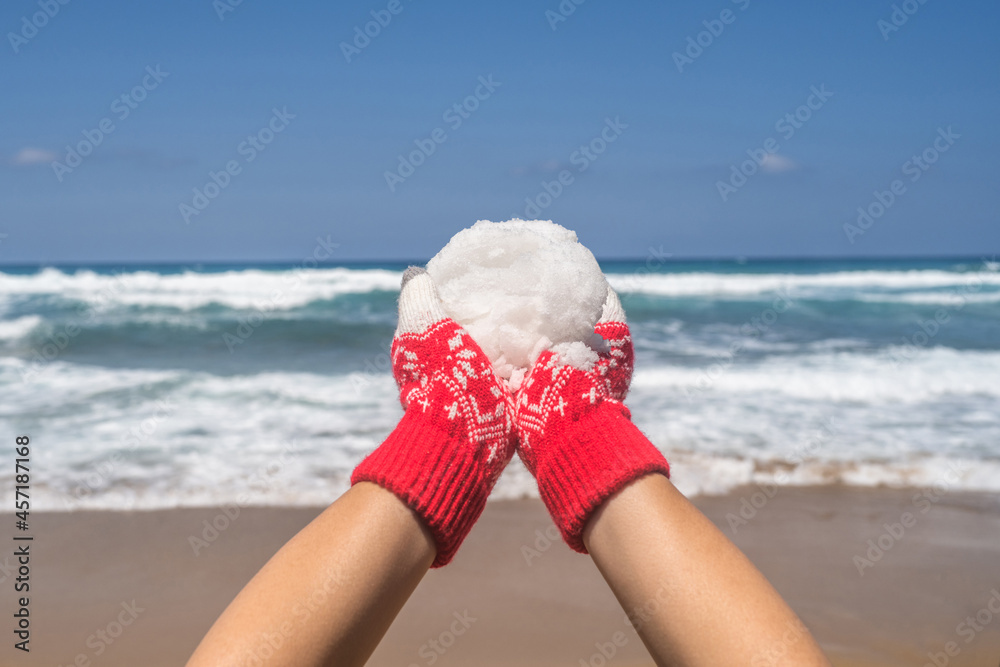 Woman hands in christmas gloves holding snowball on beach opposite sea wave. New year