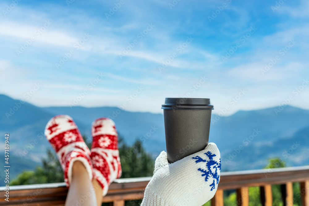 Woman in socks, boots and Christmas red hat sitting on a balcony in the mountains and drinking tea at sunset