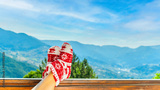 Woman in Christmas red socks, boots sits on a balcony in the mountains
