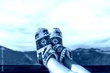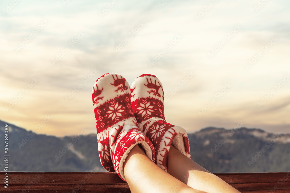 Woman in Christmas red socks, boots sits on a balcony in the mountains putting her feet on the wooden terrace railing at sunset