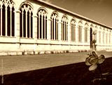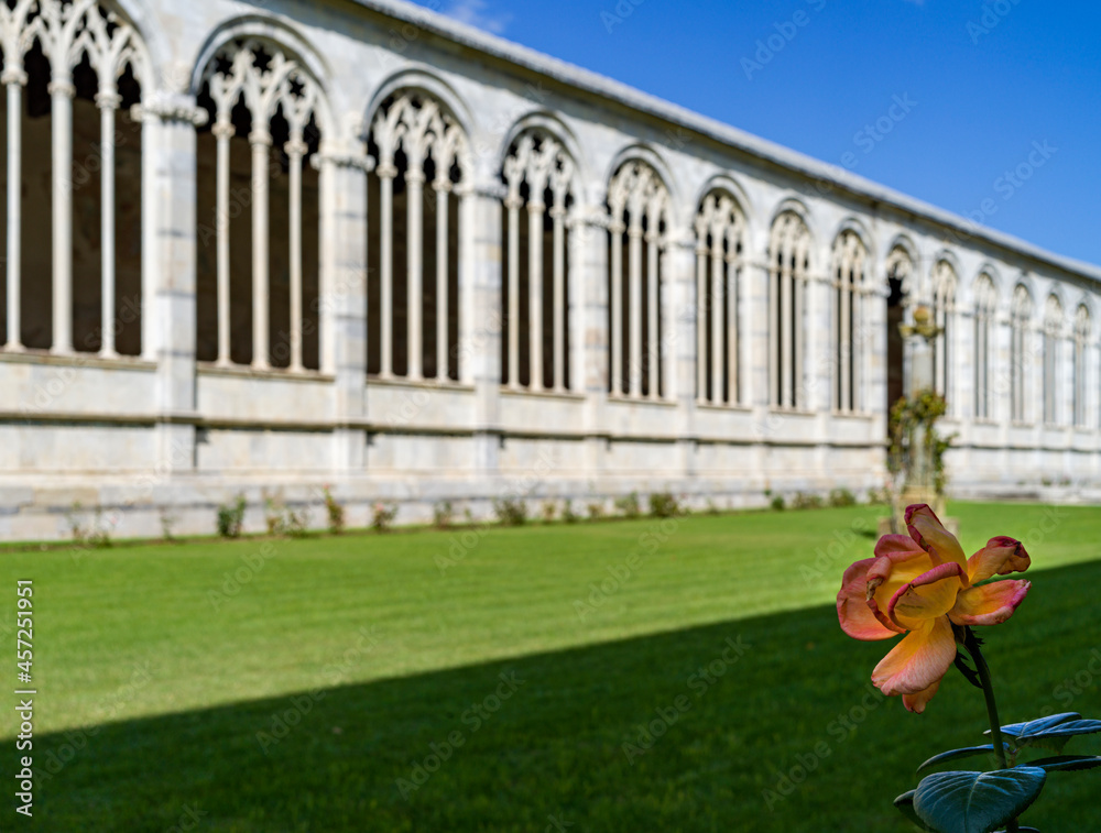 Flower in a garden with background of an architecture with arches and historical columns