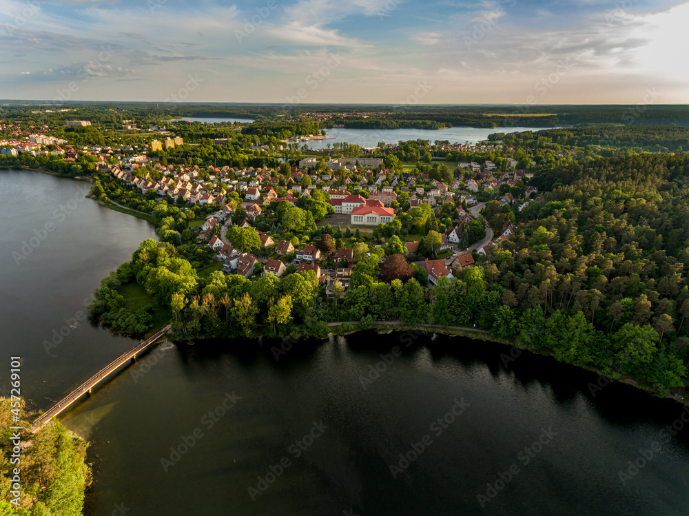 Olsztyn Lake Dlugie, bird's eye view. Wooded shores, the sky reflecting in the water table and a bridge over the lake - Warmia and Masuria, Poland