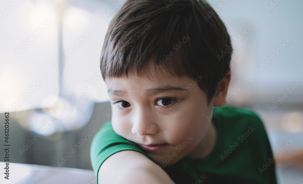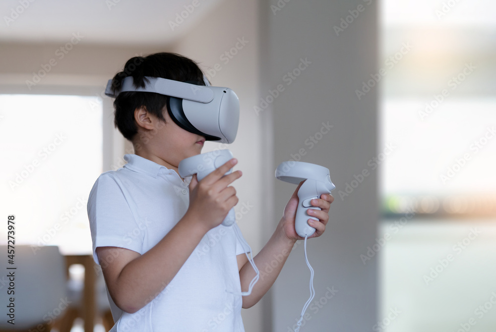 Amazed young kid wearing virtual reality goggles. Emotional Boy playing video games looking in VR headset. Portrait of Mixed race boy experiencing 3D gadget in living room.