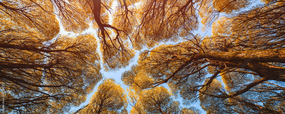 Atmospheric autumn landscape. A bottom-up view of the crowns of the branches of yellow autumn trees. Background of the top of the forest