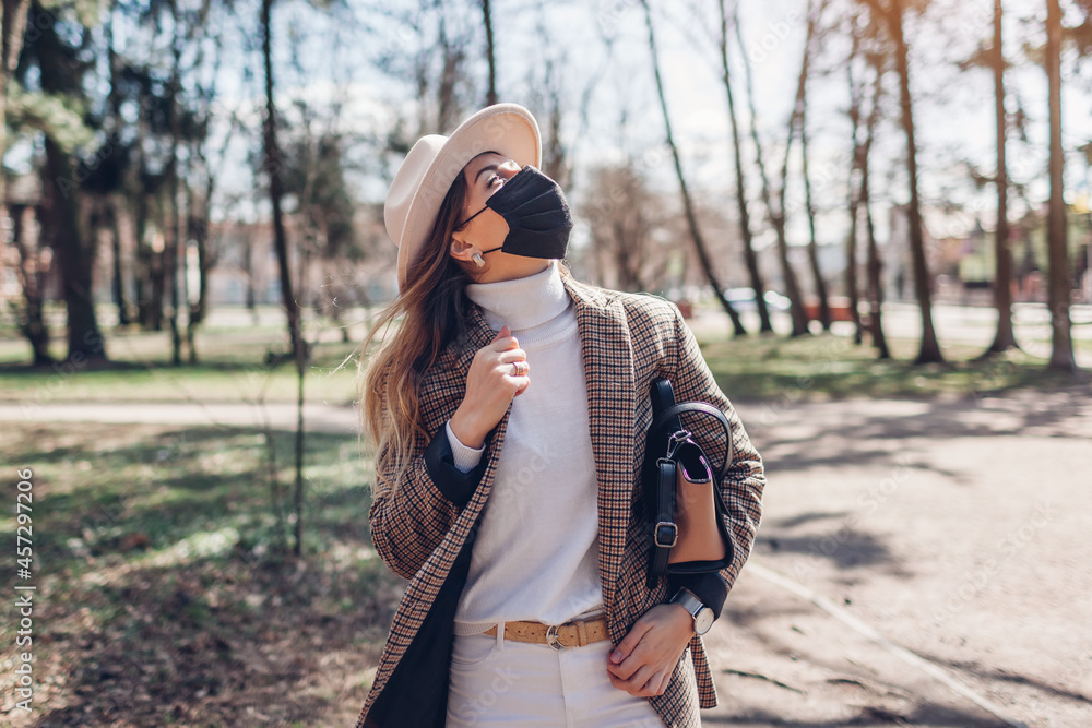 Stylish woman in reusable mask enjoys sun and fresh air outdoors during coronavirus covid-19 pandemic in park.