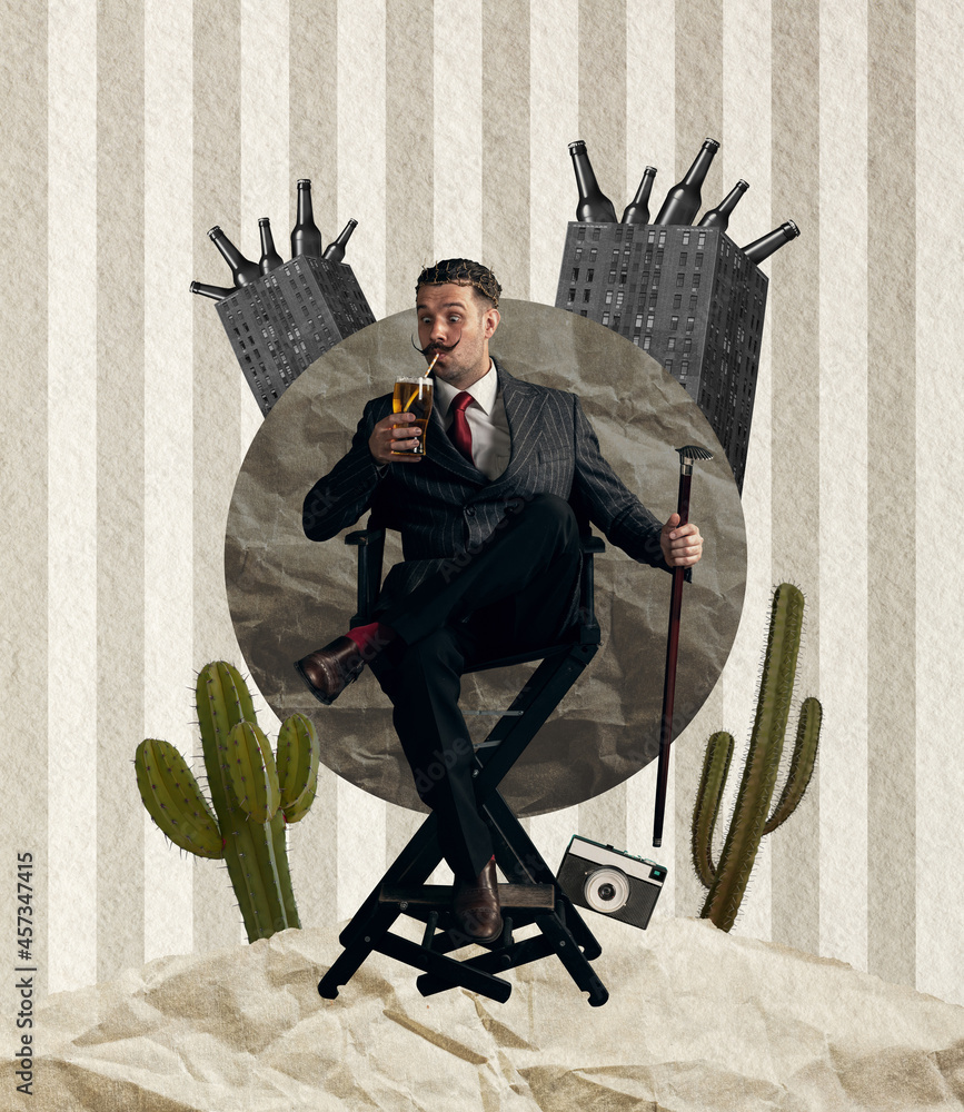 Contemporary art collage. Crazy man in black suit drinking beer. Concept of festival, national traditions, taste, drinks and holidays, oktoberfest