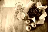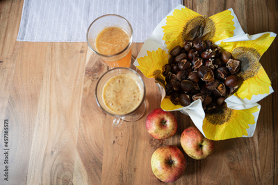 Top view of fall themed still life with roasted chestnuts