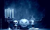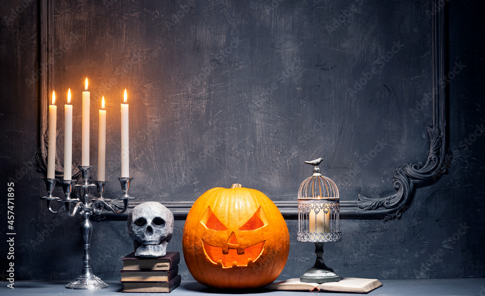 Scary laughing pumpkin and old skull on ancient gothic fireplace. Halloween, witchcraft and magic.