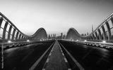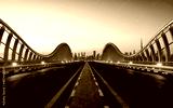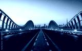 Beautiful view of Meydan Bridge in Dubai. Modern artistic bridge in Dubai. Night architectural shot of a bridge with curvy blue lights.