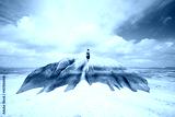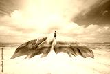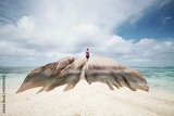 Man standing on rock and looking at view. Lonely tourist enjoying calm on idyllic beach in Seychelles.