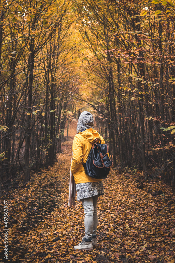 Tourist woman standing on footpath in autumn woodland. Hiking in nature at fall season