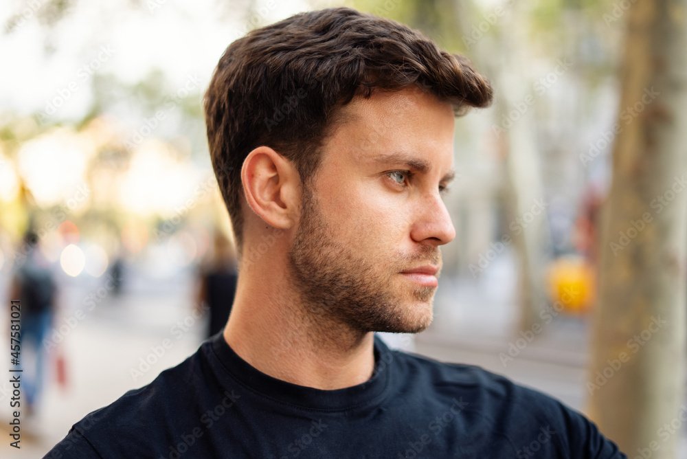 Young man with stylish haircut in city