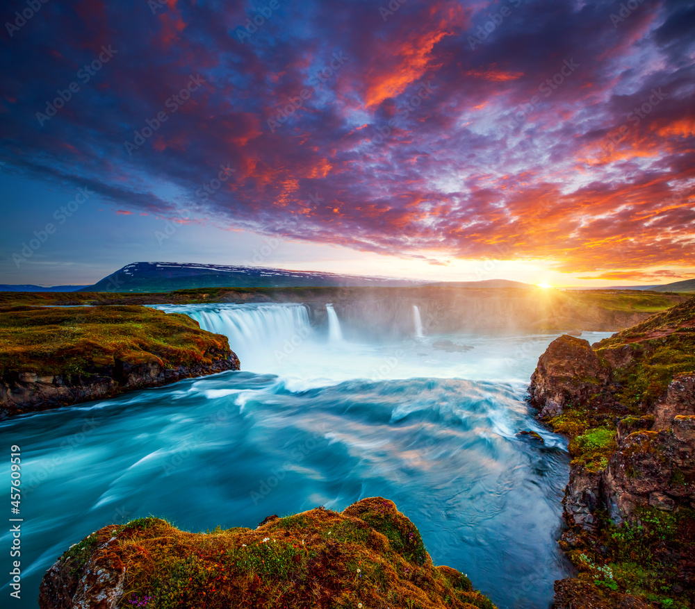 Breathtaking view of the grand Godafoss cascade. Skjalfandafljot river, Iceland, Europe.