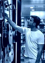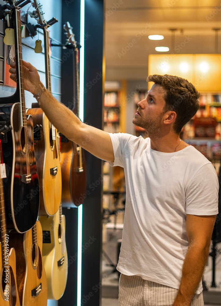 Musician buying guitar in store